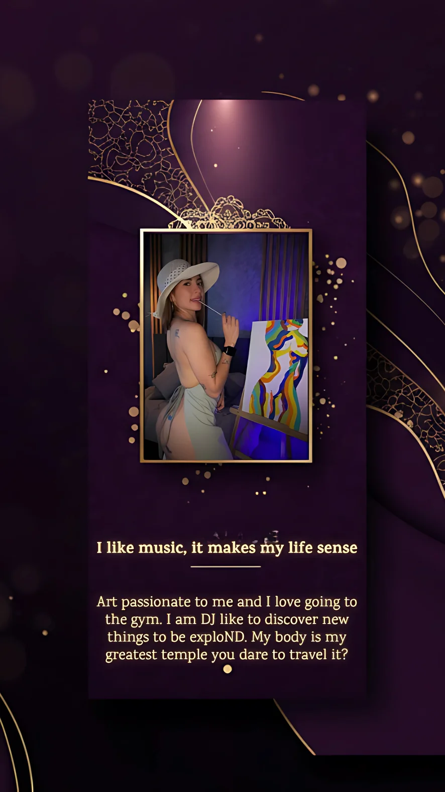 I'm an artistic, sensual, and fit girl who loves to play with the beauty of movement and expression. I bring together body art, fitness, and erotic teasing to create an experience that's both sexy and unique.